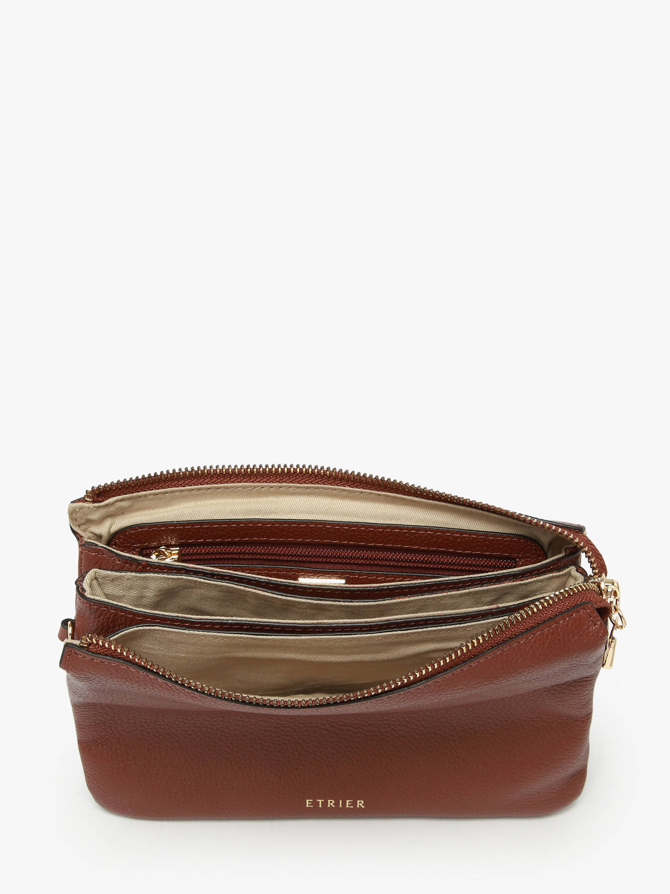 The ETRIER crossbody bag from the TRADITION line is adorned with gold metal accessories for a sophisticated look. Made of cowhide leather, it closes with a zipper. The leather shoulder strap, adjustable and removable, offers versatile carrying options: over the shoulder or crossbody. The spacious interior includes three compartments with a zip pocket, all lined with cotton for a luxurious touch. An elegant accessory to complement your outfits with style.